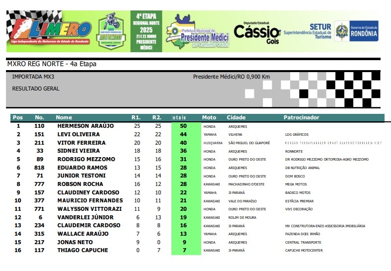 Na categoria Importada MX3 em primeiro lugar ficou o piloto Hemerson Araújo #110, da cidade de Ariquemes, em segundo ficou Levi Oliveira #151 que é de Vilhena, já em terceiro lugar ficou Vitor Ferreira #211, de São Miguel do Guaporé.