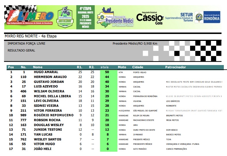 No município de Presidente Médici os pilotos disputaram as categorias - Nacional Pró, Nacional MX3, Importada Iniciante, Nacional 230, Importada MX3, Junior, Feminina, Importada Pró, Importada MX4, Importada MX5, Nacional Intermediaria e Mirim.