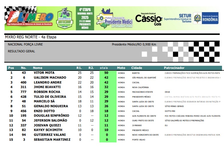 Na categoria Nacional Força Livre quem conquistou o pódio foi Vitor Mota #43, de Buritis, em segundo ficou Ualison Machado #6, de São Miguel do Guaporé e na terceira colocação o piloto de Cacoal, Leandro André #400.