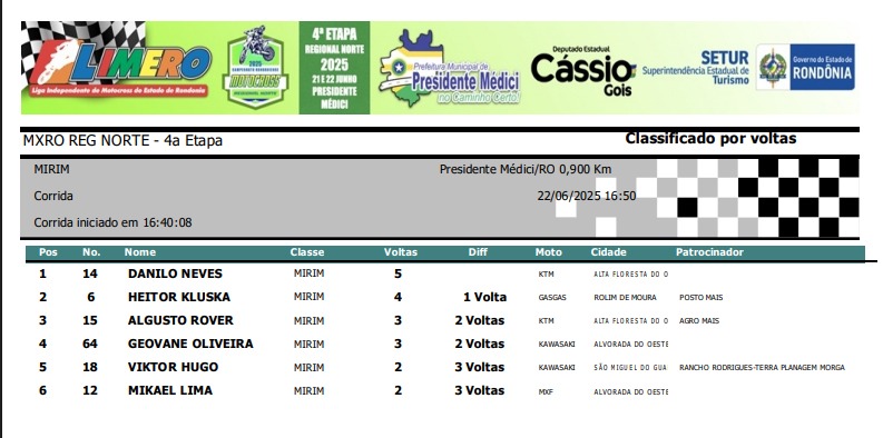 Na Mirim quem ficou em primeiro lugar foi Danilo Neves #14, que é do município de Alta Floresta D'Oeste. Na segunda colocação ficou o piloto de Rolim de Moura, Heitor Kluska #6 e no terceiro lugar Algusto Rover #15, também de Alta Floresta D'Oeste.