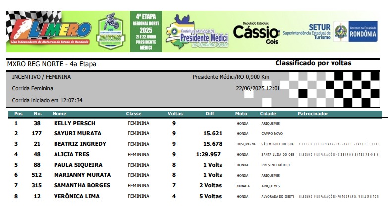 Na categoria das mulheres os resultados foram os seguintes, Kelly Persh #38 de Ariquemes, em primeiro lugar, logo após ficou a pilota Sayuri Murata #177, de Campo Novo e ocupando a terceira colocação, ficou Beatriz Ingredy #21, do município de São Miguel do Guaporé.