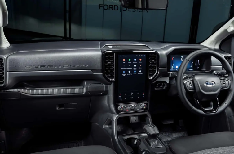 A cabine vem equipada com quadro de instrumentos digital de 8 polegadas e central multimídia SYNC 4 de 12 polegadas, compatível com Android Auto e Apple CarPlay sem fio.
