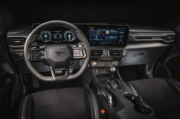 Por dentro, o esportivo também possui elementos exclusivos. O interior recebe detalhes escurecidos, logotipo Dark Horse no volante e costuras azuis nos bancos, reforçando a identidade da versão mais focada em performance.