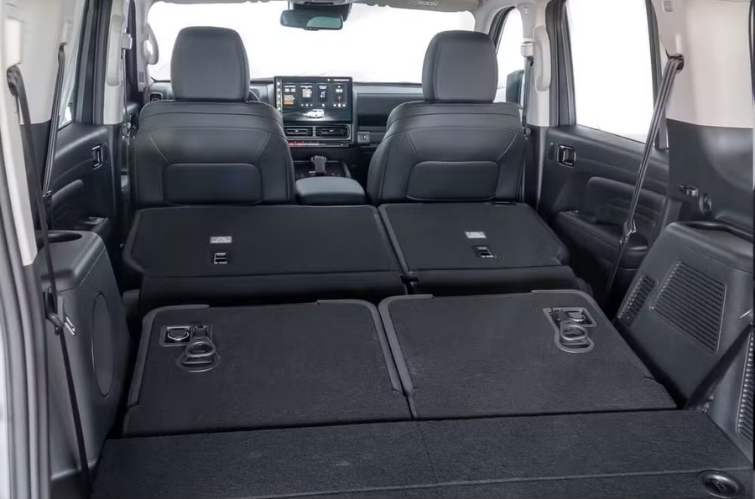 Mesmo na última fileira, o espaço surpreende positivamente dentro das limitações naturais da categoria. O porta malas, com bancos rebatidos, reforça a proposta voltada ao turismo e transporte de carga.