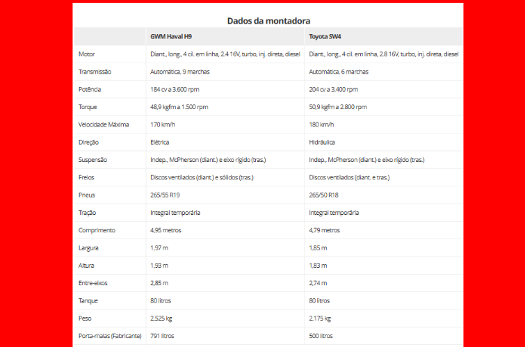Para apimentar ainda mais o duelo, o Haval H9 já conseguiu superar o SW4 em volume mensal de emplacamentos recentemente, algo simbólico diante da força histórica da Toyota no segmento. Ainda assim, o modelo japonês segue líder no acumulado anual.