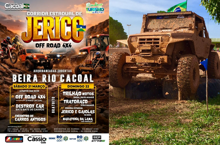 A cidade de Cacoal (RO) recebe, nos dias 21 e 22 de março, a Corrida Estadual de Jerico Off Road 4×4, evento que promete movimentar o município com diversas atrações voltadas ao automobilismo fora de estrada.