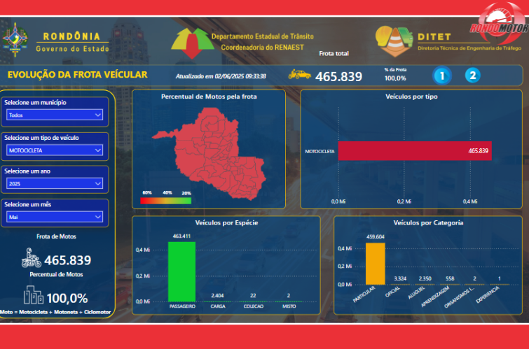 Segundo o painel interativo apresentado, Rondônia conta com 465.839 motocicletas registradas, número que inclui motonetas, ciclomotores e motocicletas, representando 100% da frota quando esse filtro é aplicado. Em comparação, o número de automóveis registrados é de 348.650 veículos.