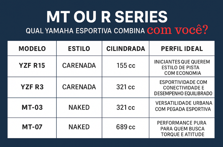 A Yamaha é reconhecida mundialmente por oferecer motos que combinam desempenho, design e tecnologia. No segmento esportivo, dois grupos se destacam: a linha MT, com estilo naked e visual agressivo, e a linha R, com carenagem e proposta mais voltada ao estilo pista. Mas afinal, qual delas combina mais com você?