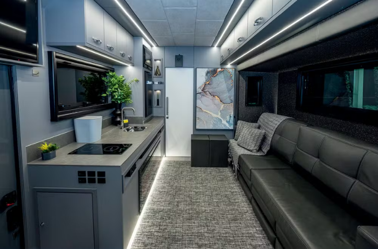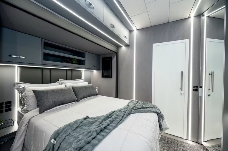 O destaque do motorhome é o espaço interno. Ao todo, são cerca de 45 metros quadrados, ampliados por um sistema de slide-out, que projeta parte da estrutura para fora quando o veículo está estacionado. O recurso aumenta significativamente a área útil e proporciona conforto semelhante ao de um apartamento.