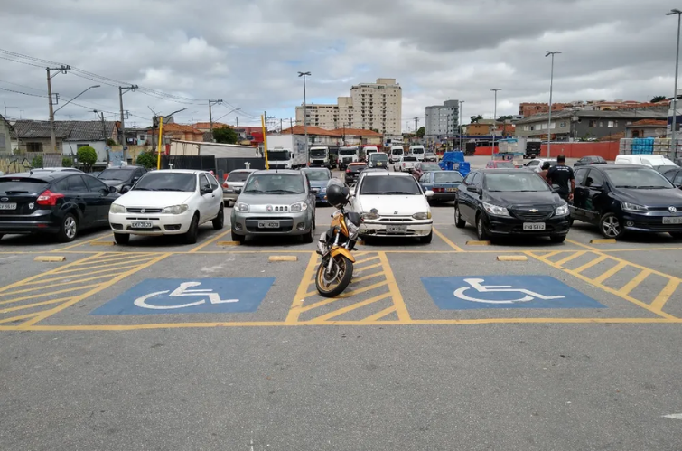 Vaga acessível: 3,50 m de largura + faixa lateral de 1,20 m, com 5,50 m de comprimento.