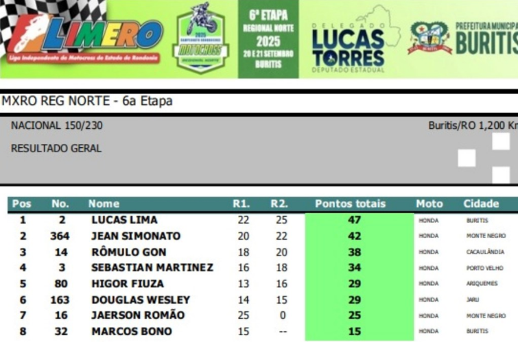 O município de Buritis foi palco da 6ª etapa do Regional Norte de Motocross 2025, realizada no último final de semana, dias 20 e 21 de setembro, no tradicional circuito Pé de Galinha. O evento reuniu os melhores pilotos do estado e da região Norte do país.
