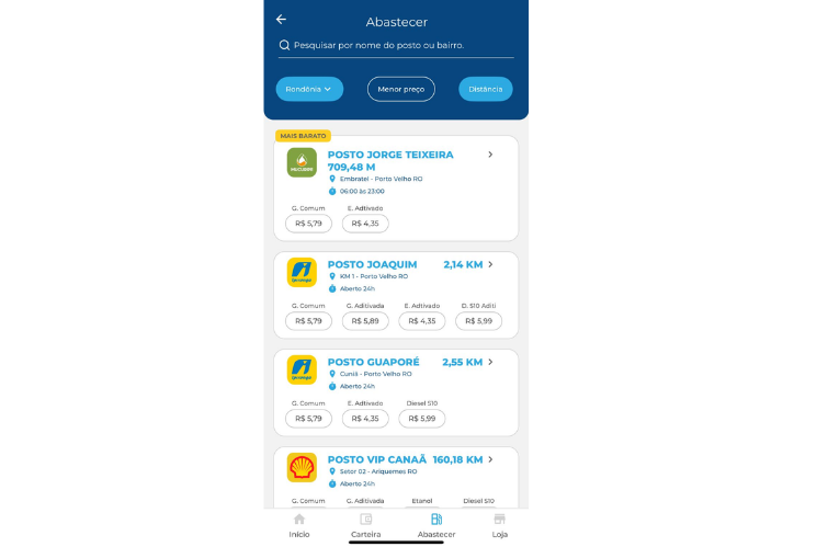 Na última atualização, o Posto Jorge Teixeira, no bairro Embratel, apareceu entre as opções mais baratas, com gasolina comum a R$ 5,79 e etanol a R$ 4,35. Outros estabelecimentos, como o Posto Joaquim e o Posto Guaporé, também exibiram preços competitivos no app.