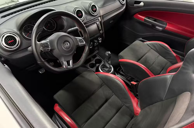 O santantônio integrado ao teto criava uma silhueta de cupê, e o interior trazia bancos concha, acabamento em Alcantara e central multimídia. Nunca virou realidade, mas antecipou elementos da Saveiro Cross.