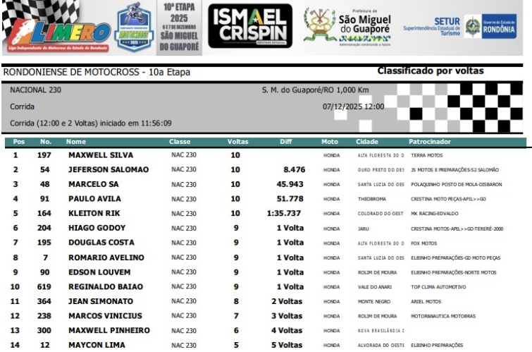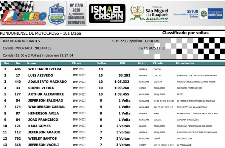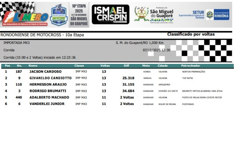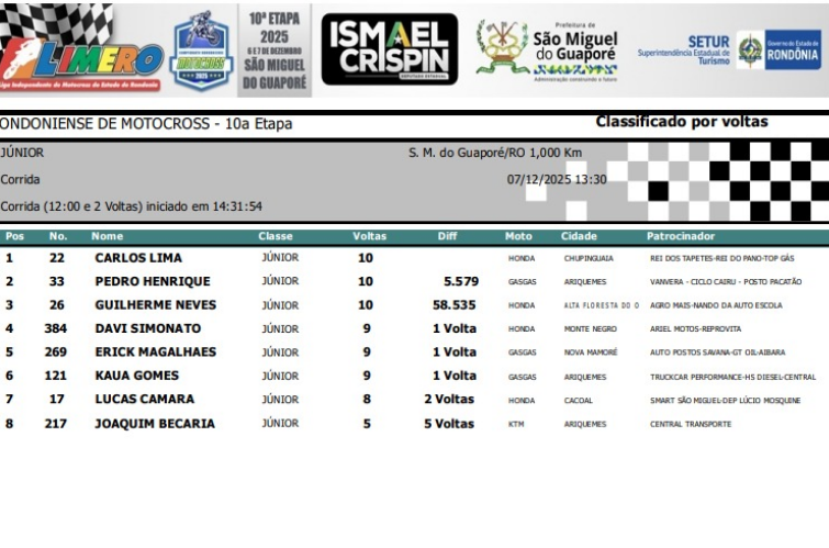 A cidade de São Miguel do Guaporé foi palco, no último fim de semana (6) e (7), da grande final do Campeonato Rondoniense de Motocross 2025. As provas aconteceram na rua Sebastião Martins Lima, nas proximidades do Pereira Latarias, próximo à BR-429, e atraíram grande público durante os dois dias de disputas.