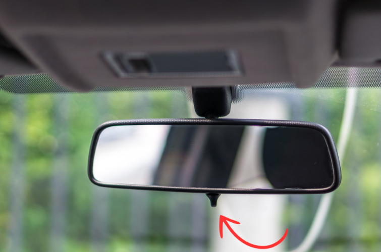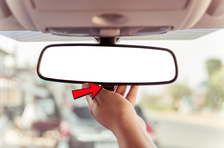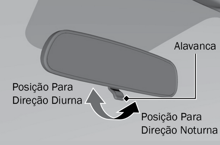 No retrovisor interno, o espelho central, há uma alavanca ou aba logo abaixo dele.