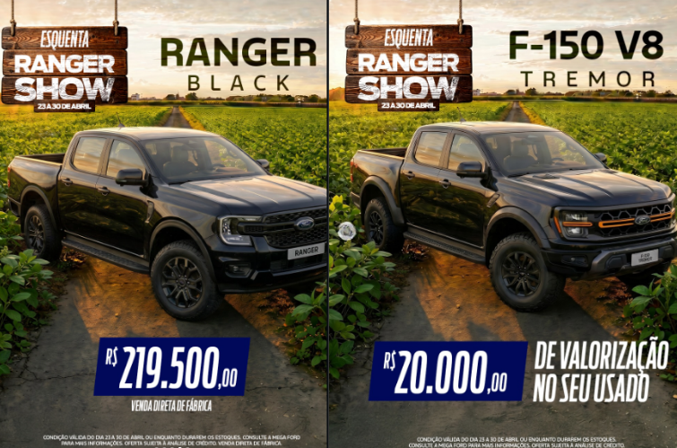 A Mega Ford deu início à campanha “Esquenta Ranger Show”, com ofertas especiais voltadas à linha de picapes da marca. A ação é válida até o dia 30 de abril ou enquanto durarem os estoques.