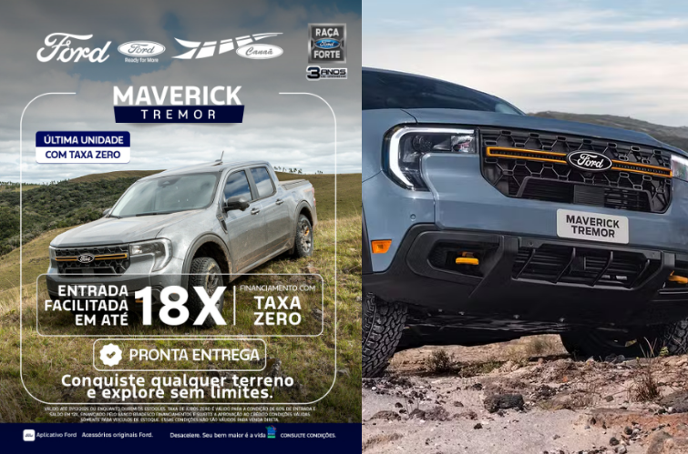 A Ford Maverick Tremor, versão com apelo off-road da picape intermediária da marca, está disponível em última unidade com condição especial de taxa zero, conforme divulgado pela concessionária. O modelo pode ser adquirido com entrada facilitada, parcelamento em até 18 vezes sem juros e pronta entrega, o que torna a oferta uma oportunidade pontual para quem busca um veículo preparado para diferentes tipos de terreno.