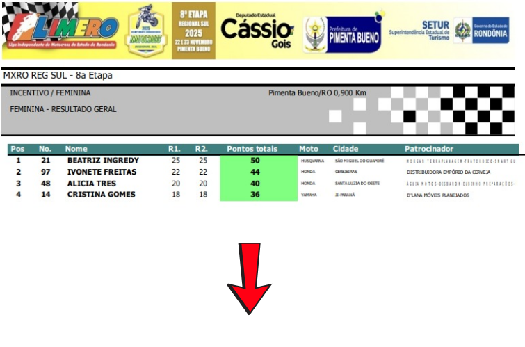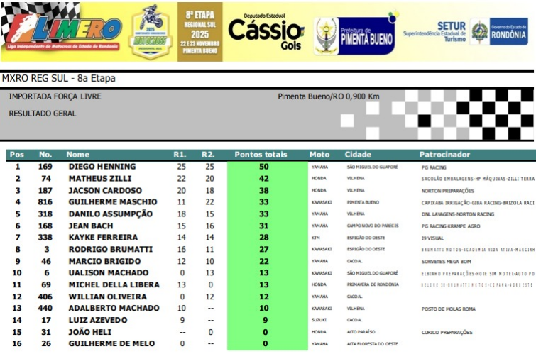 Abaixo, você confere todos os resultados por categoria da final do Regional Sul de Motocross.