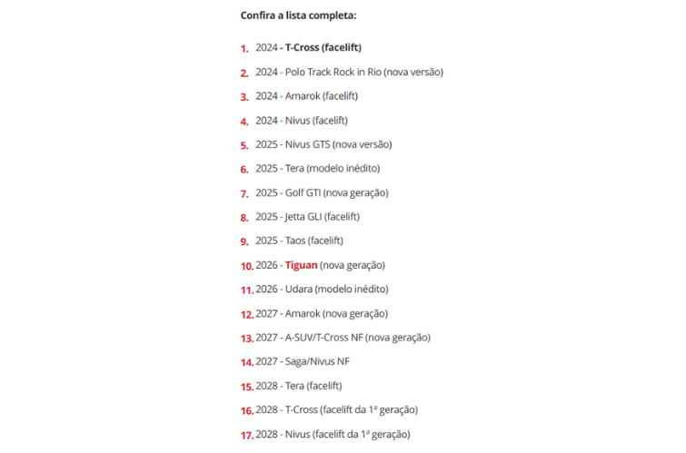 A linha 2025 da Volkswagen trará o Nivus GTS, o Golf GTI e o Jetta GLI, além do Taos reestilizado. Em 2026, será a vez do novo Tiguan e da inédita picape Udara, que substituirá a Saveiro e competirá com a Fiat Strada e Toro.